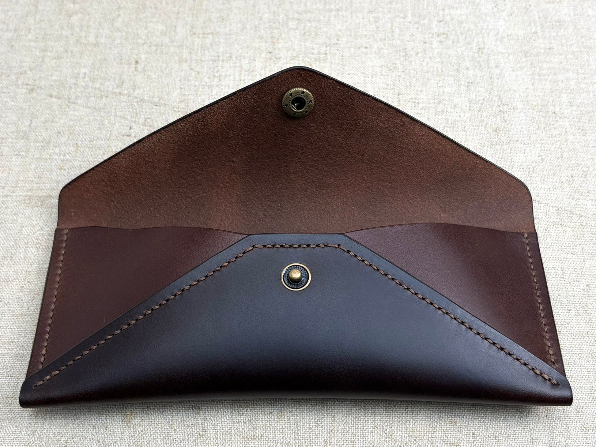 A timeless envelope-style glasses case crafted from contrasting tones of premium Italian Buttero leather. The traditional saddle stitching is proudly showcased in this elegant design, finished with a simple press stud closure. A refined way to keep your eyewear protected in style.